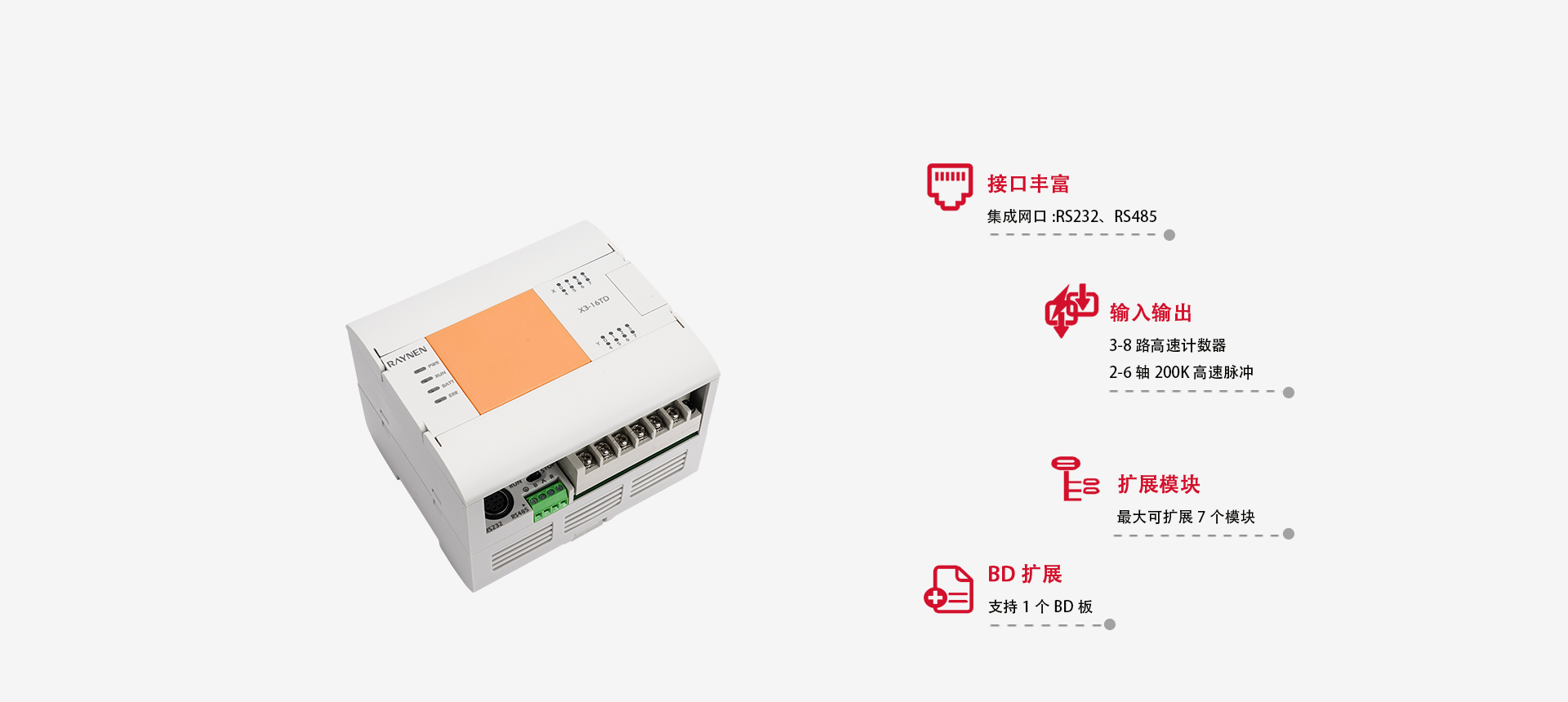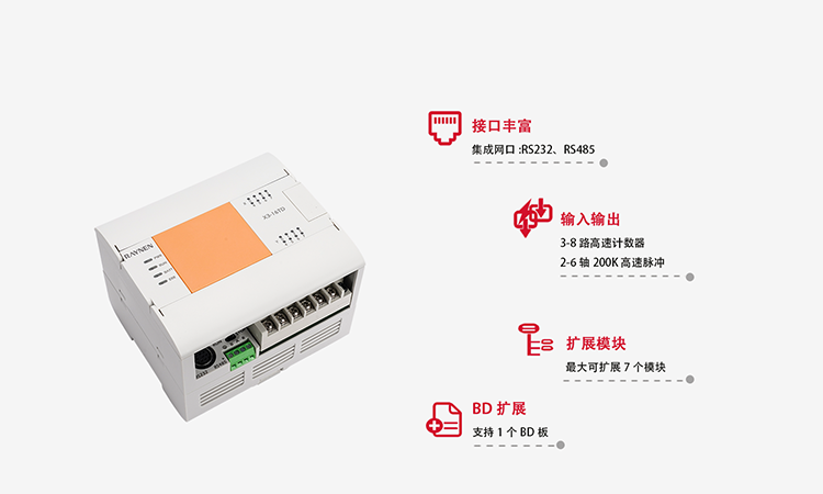 ▲ 具(ju)備(bei)2-6 軸高(gao)速(su)脈沖輸(shu)出,高(gao)速(su)計(ji)數(shu)、直線(xiàn)插補咊(he)圓弧插補等(deng)運動(dòng)控製(zhi)功能(néng)