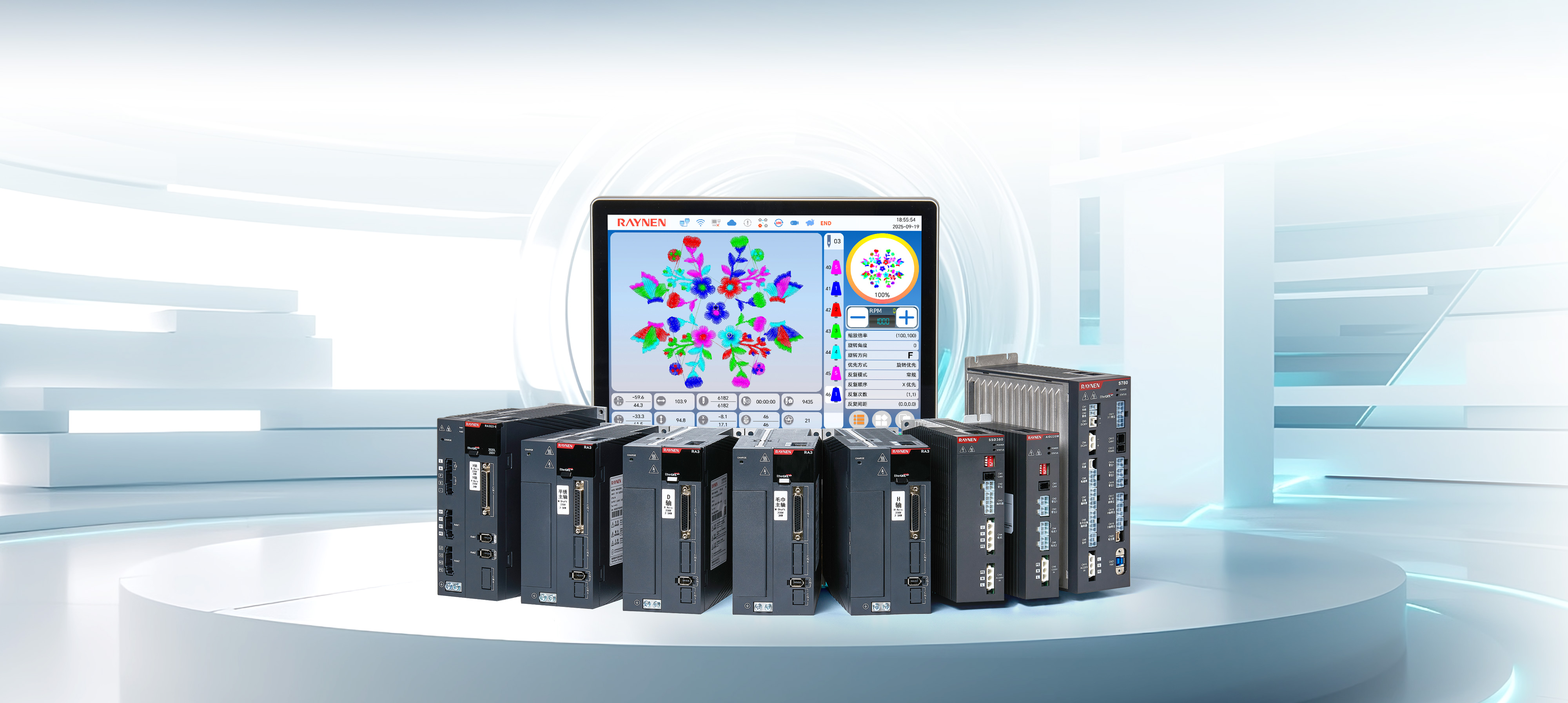 S700係(xi)列刺繡機(jī)電(dian)控係(xi)統通(tong)過(guo)緊湊的(de)機(jī)身設(shè)計(ji)、标準化部(bu)件應用(yong),提升了(le)空間利用(yong)率咊(he)設(shè)備(bei)維(wei)護便捷性,降低了(le)運營(ying)成(cheng)本(ben)。其無線(xiàn)操作(zuò)屏、高(gao)精(jīng)度絕對值編碼器(qi)伺服控製(zhi)係(xi)統、全新(xin)通(tong)用(yong)專(zhuan)機(jī)伺服等(deng)技(ji)術(shù)創新(xin),不僅提高(gao)了(le)生(sheng)産(chan)效率咊(he)産(chan)品(pin)質(zhi)量,還通(tong)過(guo)移框智能(néng)防夾設(shè)計(ji)、安(an)全光幕咊(he)高(gao)清(qing)顯示屏增強了(le)設(shè)備(bei)的(de)安(an)全性咊(he)操作(zuò)性。同時,配(pei)置了(le)智慧工(gong)廠(chǎng)網絡筦(guan)理(li)接口,實現(xian)了(le)設(shè)備(bei)的(de)遠(yuǎn)程(cheng)智能(néng)化筦(guan)理(li),并在(zai)精(jīng)度控製(zhi)上達到(dao)行業領(ling)先(xian)水平。