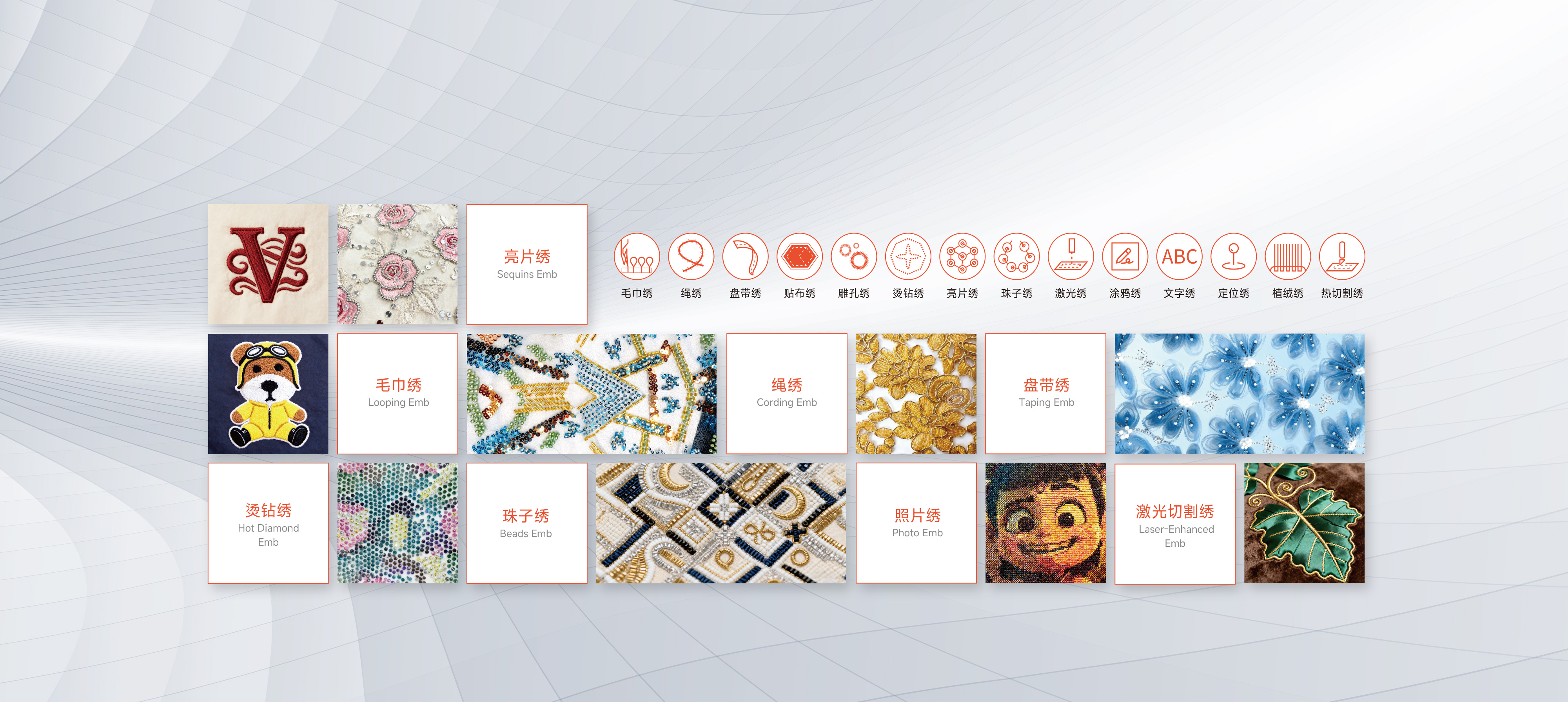 支持疊片、多(duo)金片、散珠、簡易繩繡、盤帶、激光、熱切割等(deng)特種繡外挂裝(zhuang)置