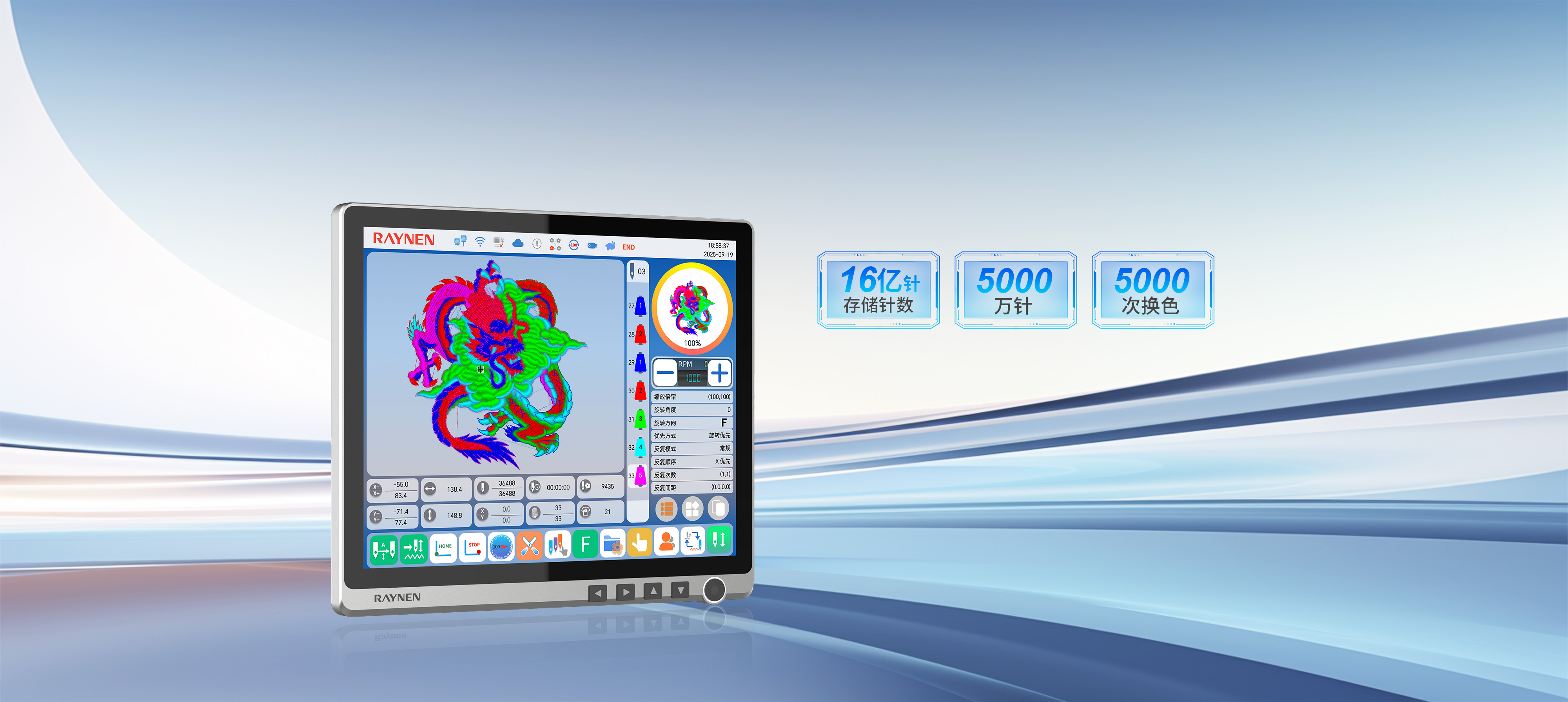 存儲針數(shu)達16億針,單(dan)箇(ge)花(huā)樣可(kě)達5000萬針、5000次換色